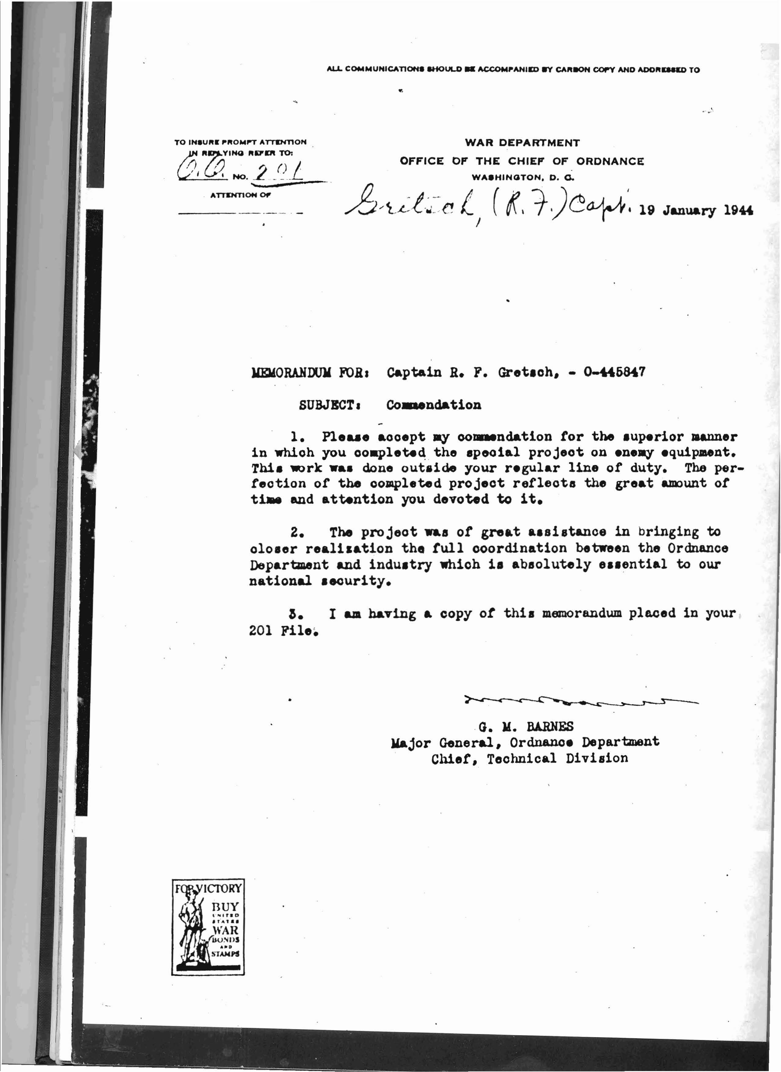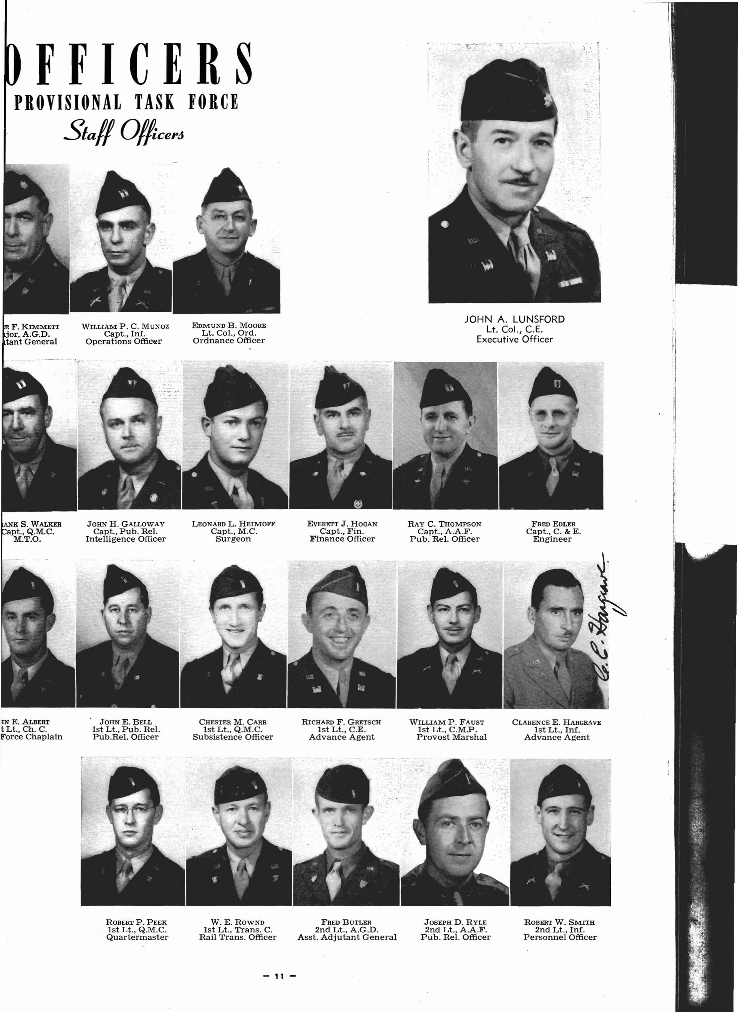 There are several autographs in the book written specifically to Dick Gretsch. These autographs appear next to the picture of the signer, much the same as one might find in a high school year book. All of the inscriptions are full of praise, for example they refer to Dick as ” a great guy” and “A great man with the kleigs and an earnest friend.” I wonder if the writer knew that Dick had an Aunt, Frances Kliegl Sommer, was who the daughter of one of the men who invented Klieg lights. Click on the page below to see a photo of Dick Gretsch and his fellow officers.