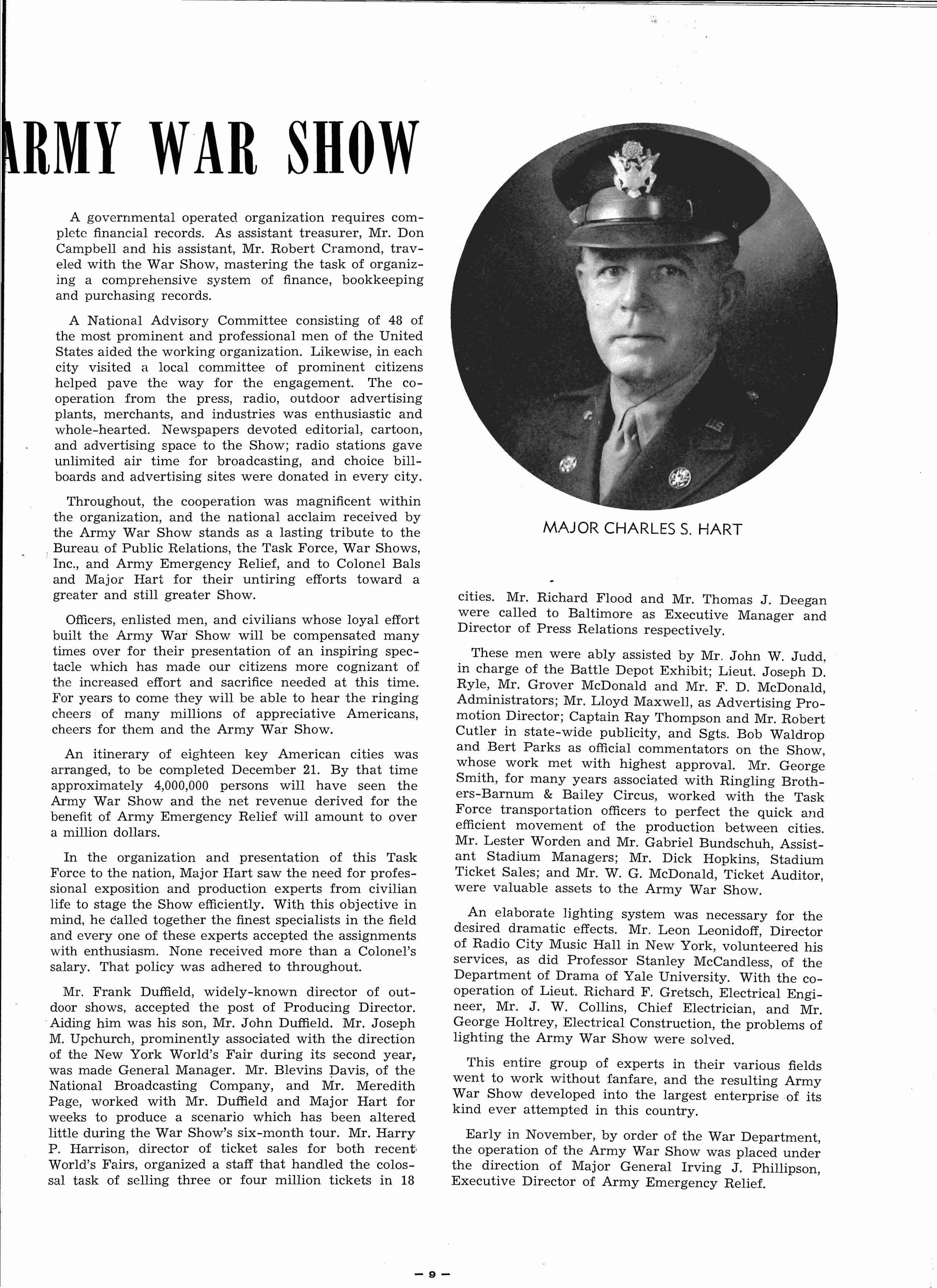 “The show was a huge success with sold out and held over performances in every city that it visited. Unfortunately, the show came to an end without much fanfare during a rainy December weekend in Atlanta. There was no special ceremony dissolving the unit nor were there any special certificates or documents given out to any member who had participated in the show. Basically, the unit just faded away with troops returning to their original duty stations. By the time the show had come to an end approximately 2,300 officers and men had served with the unit. Later, because of the show’s huge success and the clamor for more, local Army Commands would continue the tradition and provide the public with further war shows. But, the days of a central War Show that would travel throughout the country was over, War demands made the logistics of continuing such a venture impossible.”