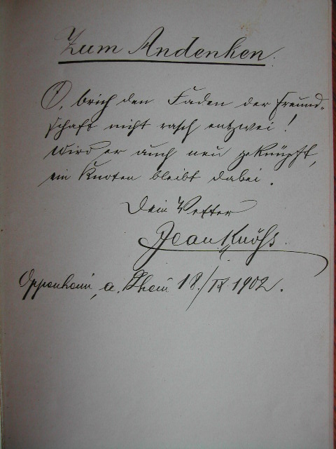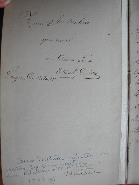 These dried violets tied with a satin ribbon were found inside the Autograph Book or “Poesie Album” as it is called in German of Hattie Dieter. This autograph book was given to Hattie by her mother when Hattie was 16 years old. Her mother, Helen Barenz Dieter, was 46.