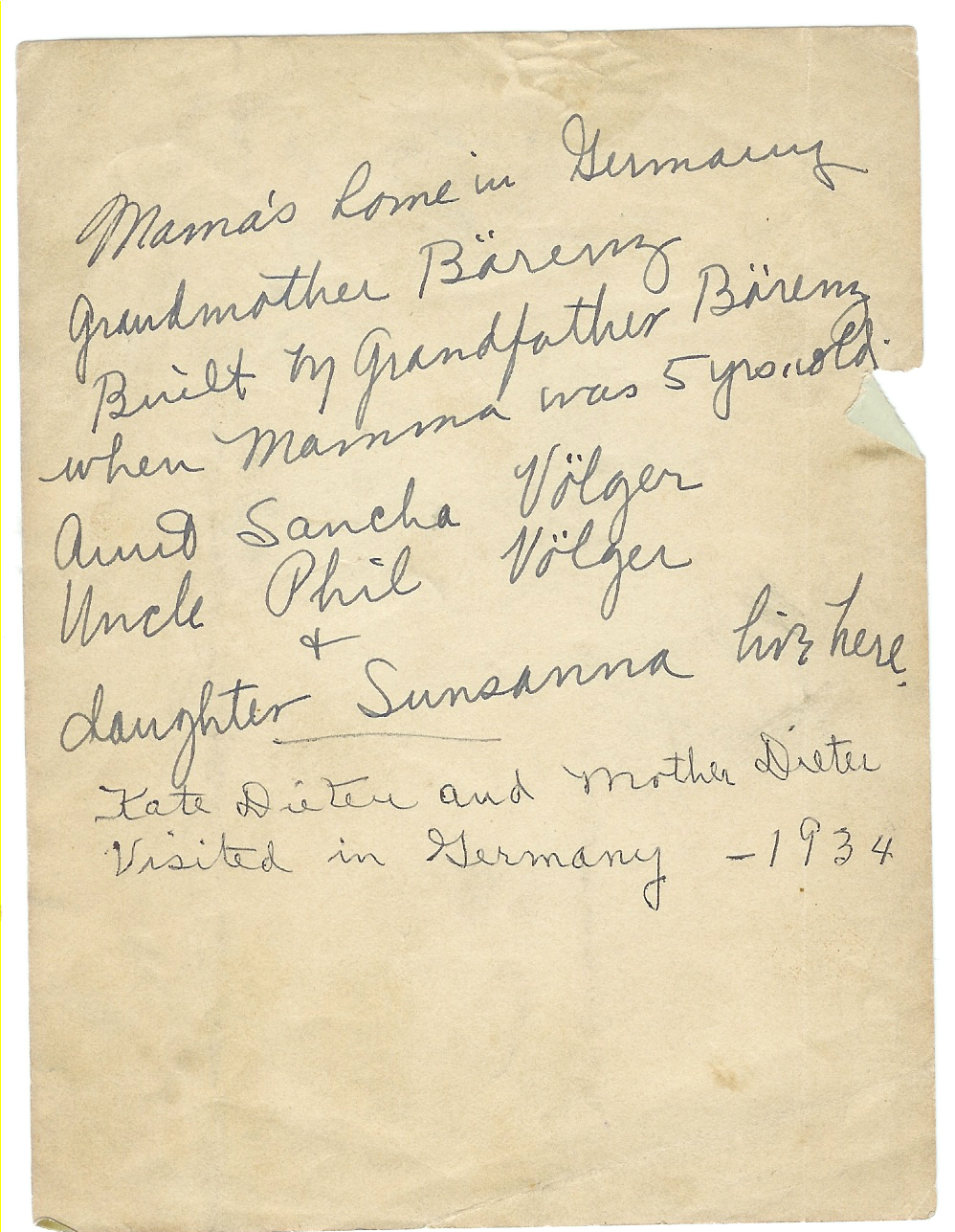 Mama’s home in Germany. Grandmother Bärenz. Built by Grandfather Bärenz when Mamma was 5 years old. Aunt Sancha Volger Uncle Phil Volger & daughter Susanna live here. Kate Dieter and Mother Dieter visited – 1934