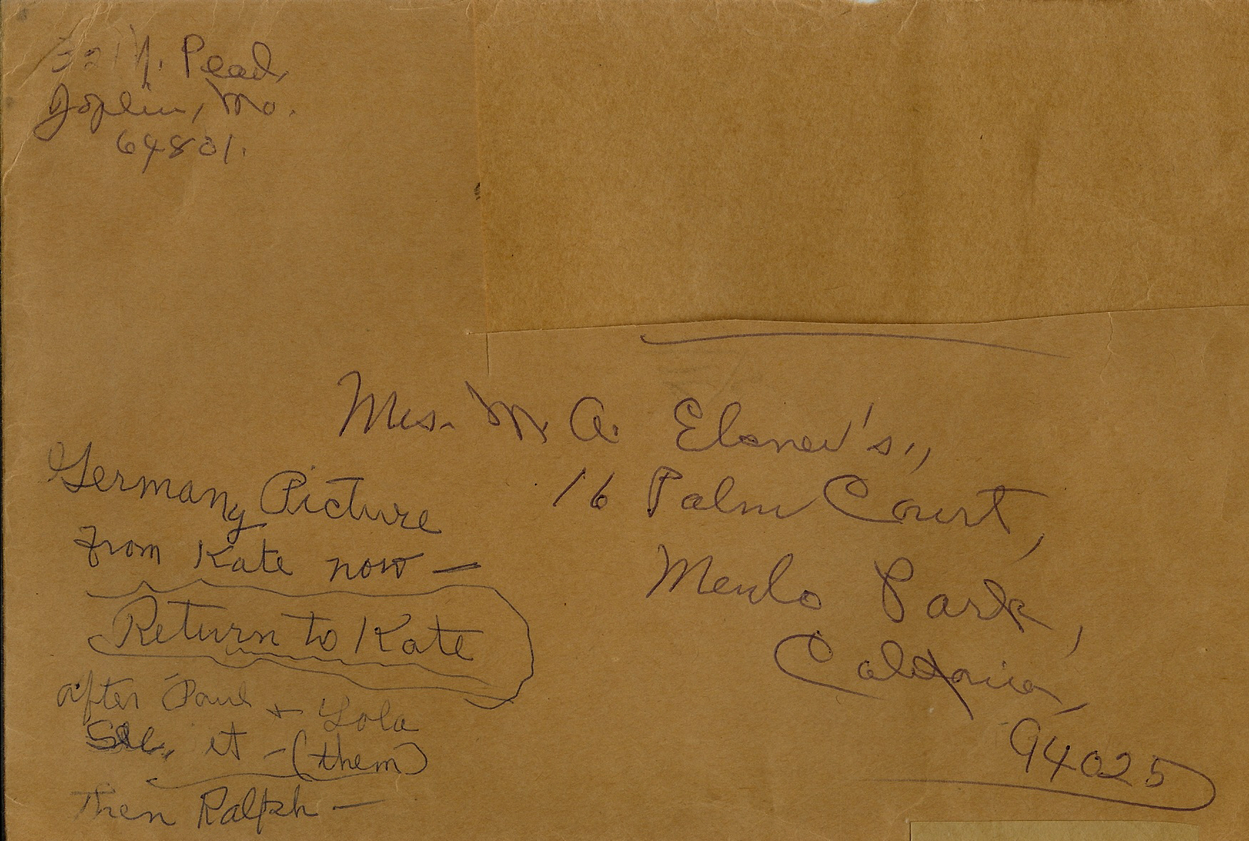 It was addressed to Mrs. M.A. Elsner, 16 Palm Court, Menlo Park, California 94025. It was from 321 NOrth Peral Street, Joplin, Mo 6480.