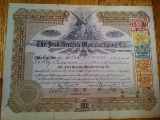 Helene’s sister, Elsa Gretsch received a certificate for 42 shares of the Fred Gretsch Mfg, Co., signed by her older brothers Fred, President, and Walter, Treasurer. Each share was worth $100.00.