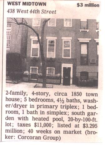 This Residential Sales ad from the March 6, 2003 New York Times, show a townhouse just four blocks north of the Liecht family home at 404 W 40th Street. The townhouse pictured was built at the same time as the Leicht home.